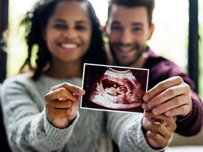 A man and woman proudly hold up an ultrasound picture of their baby, smiling happily at the camera.