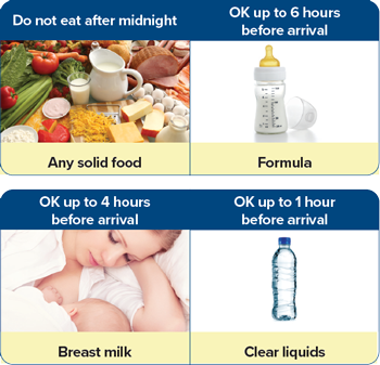 - Patients may drink clear liquids, such as apple juice, water, Pedialyte, and Gatorade up until 1 hour before arrival