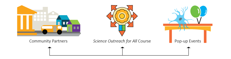 NEURO2ALL is built around a custom-designed, two-credit course for undergraduate and graduate students. In this course, students work individually and collaboratively to develop, plan, and lead hands-on learning modules introducing core neuroscience concepts at pop-up events hosted by community partner organizations (e.g., schools and museums). This course offers participants the opportunity to engage in fun and educational experiences, and reinforces the message that scientific literacy empowers individuals to make informed decisions in everyday life.