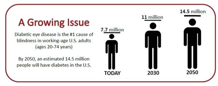 Damage to the retina due to diabetes is the leading cause of blindness in the working age US population. Timely eye exams, at least every year can prevent at least 90% of this vision loss, but across the US, only about 50% of those with diabetes see an eye doctor annually.