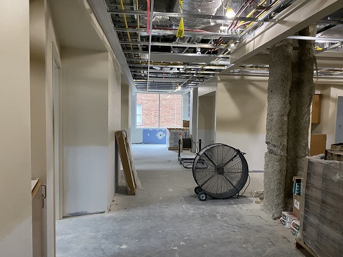 During the week, crews will be working inside on finishing drywall framing, painting, and various mechanical installations. Outside, the tower crane will be in use moving materials from the ground to various floors in the building. Window and siding installation continues as well as roofing. Crews will also be working to install a new manhole and storm piping.