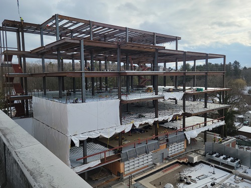 During the week, the tower crane will be in operation with the roofing and other activities on site. The 6th floor concrete slab installation is tentatively scheduled for Tuesday, February 15th starting at 7 a.m. Concrete finishing does have the potential to run late into the night but will not go past 10 p.m. per the City of Rochester noise ordinance. Mechanical hangers are being installed on the 7th and 8th floors new decks for future installation of the mechanical piping. Crews are preparing for concrete slab pours with shear studs, rebar, fire stopping sleeves, embedments, and rebar. The stair risers are also being filled with concrete for easier access from floor to floor. Crews are installing temporary roofing/vapor barrier on the 7th floor (weather dependent activity). Interior and exterior framing has started on the 1st and 2nd floors.