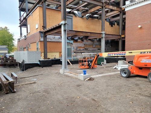 Mechanical hangers are also being installed on the 2nd, 3rd, 4th and 5th floor’s new decks for future installation of mechanical piping. They will also be preparing for concrete slab pours with shear studs, rebar, fire stopping sleeves, and embedments. This includes drilling into the East side second and third floor concrete slabs. Crews have also started to build the temporary building wrap enclosure for the winter.
