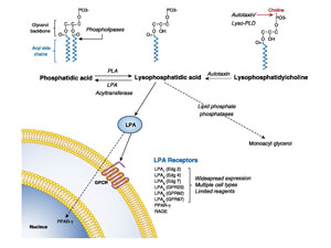 Lysophosphatidic acid (LPA) is a pleiotropic lipid molecule with potent effects on cell growth and motility. Major progress has been made in recent years in deciphering the mechanisms of LPA generation and how it acts on target cells. Most research to-date has been conducted in other disciplines, but emerging data indicate that LPA has an important role to play in immunity. A key discovery was that autotaxin (ATX), an enzyme previously implicated in cancer cell motility, generates extracellular LPA from the precursor lysophosphatidylcholine (LPC). Steady-state ATX is expressed by only a few tissues including high-endothelial venules in lymph nodes, but inflammatory signals can up-regulate ATX expression in different tissues.