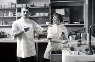 Marge (last name unknown) and hygienists in the lunchroom at the Eastman Dental Dispensary.