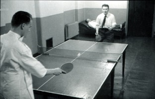 Drs. Altinsall and Elwood play ping pong while other residents watch.