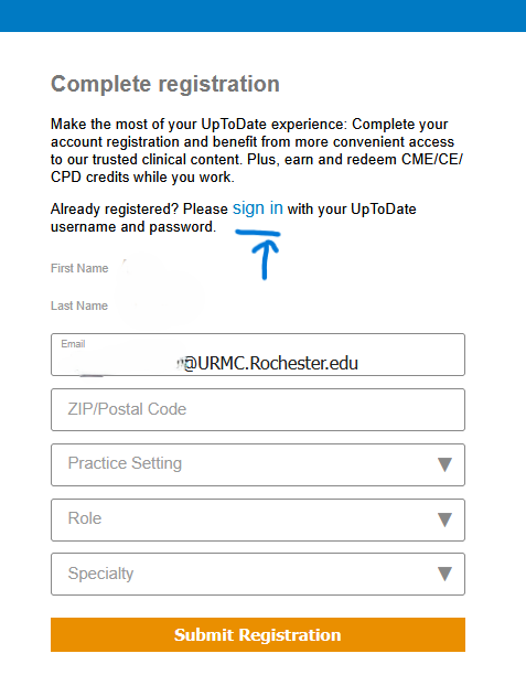 - During the registration process, click the “sign in” link on the registration page to sign in with existing UpToDate account username & password