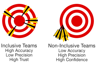 Diverse and inclusive teams are twice as creative, twice as productive and twice as accurate compared to homogeneous teams. Worse, homogeneous teams are twice as confident in their half as accurate decisions—a scenario to avoid.
