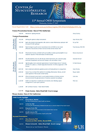 The Annual Center for Musculoskeletal Research (CMSR) Symposium is a special event held over the course of an entire day each year at the University of Rochester Medical Center (URMC). The Symposium is designed to not only showcase the current year's musculoskeletal research, but also provide a platform for trainees to present their data and interact with scientists throughout the URMC community and visiting scientists from other institutions. The events that take place during the Symposium include: a poster session for all trainees in the Center as well as trainees outside the Center performing musculoskeletal research, two plenary speaker sessions with five trainee presentations, three faculty presentations, and a visiting keynote speaker presentation. Three trainee travel awards are presented to two pre-doctoral and one post-doctoral candidates. Following the Symposium, the CMSR has a social event to celebrate the accomplishments of all of our trainees. The Annual CMSR Symposium is supported in part by our NIH T32 Training Grant (AR053459).