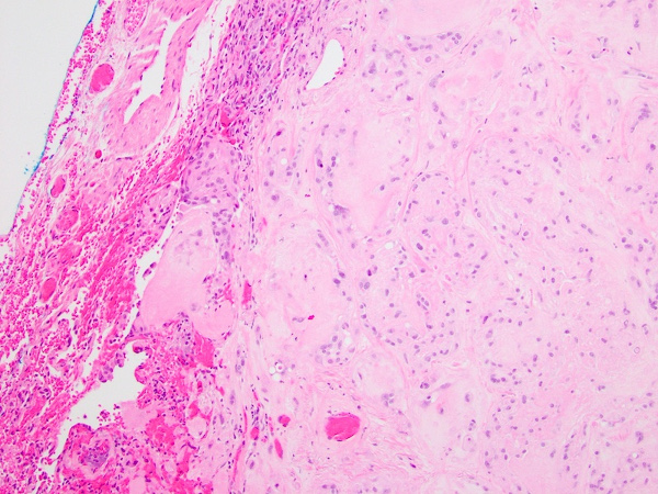 The patient underwent video-assisted thoracoscopic surgery of the right lower and upper lobes of lung. Gross examination of the resected specimen revealed two well-demarcated, intraparenchymal solid, round, white, firm tumors measuring 0.8 cm and 1.3 cm in greatest dimension. Microscopic examination revealed a well-circumscribed neoplasm composed of nests and cords of tumor cells within a myxohyaline stroma (Figure 1). The tumor cells had well-defined borders, abundant eosinophilic cytoplasm, and primarily round nuclei with open chromatin and conspicuous nucleoli (Figure 2). There were apparent cytoplasmic vacuoles in some of the neoplastic cells. No notable necrosis, mitotic activity, or nuclear pleomorphism was present.