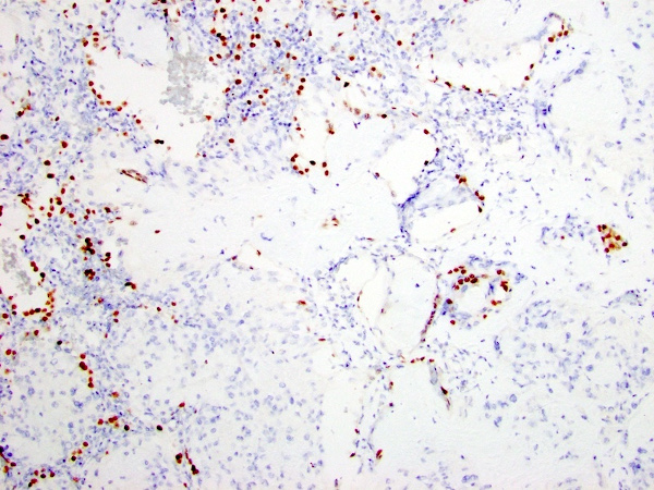 Immunohistochemical stains revealed that the tumor cells were positive for CD31, CD34, and ERG (Figure 3-5). The tumor cells did not mark with pancytokeratin, smooth muscle actin (Figure 6), epithelial membrane antigen, S-100 protein, HMB-45, SOX10, chromogranin, TTF-1 (Figure 7), PAX8, or desmin. No amyloid deposition was identified with Congo red stain.
