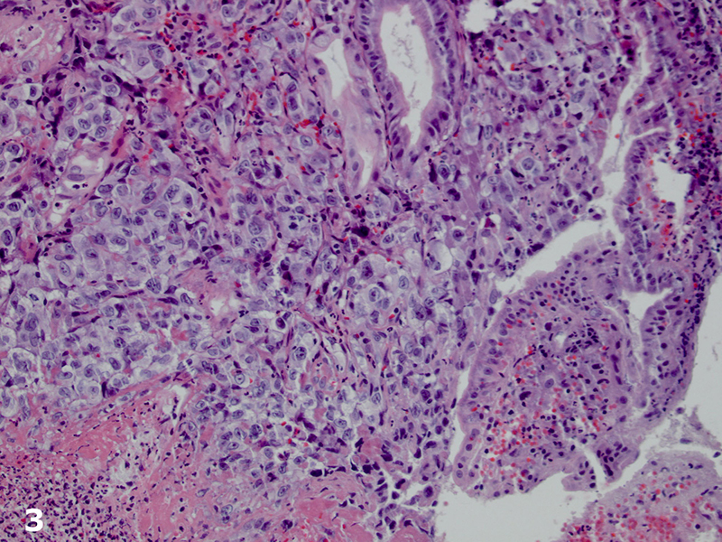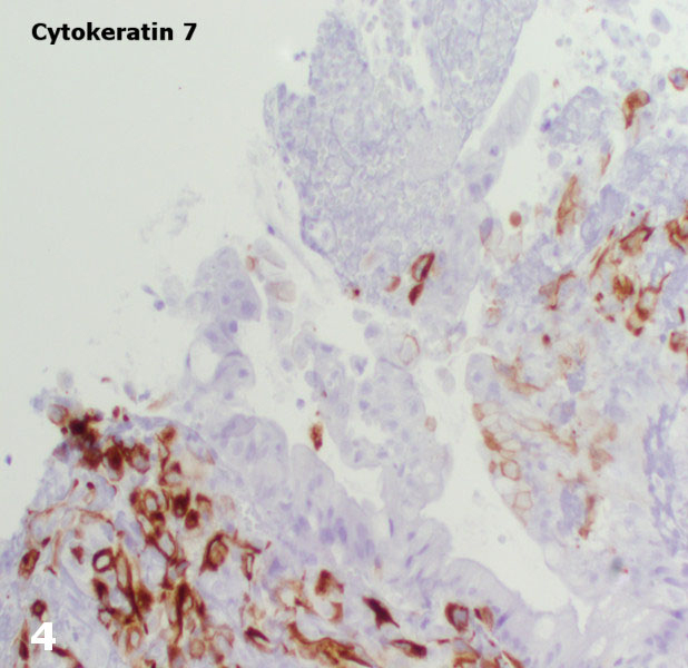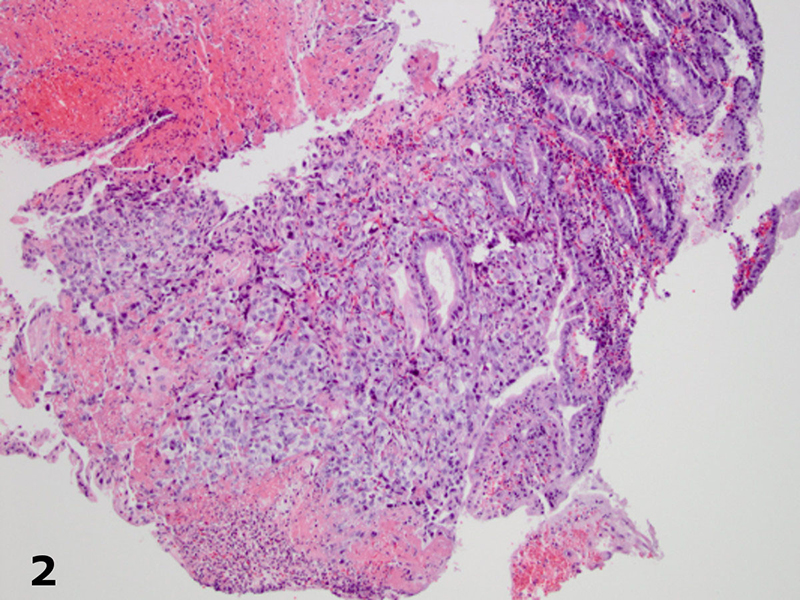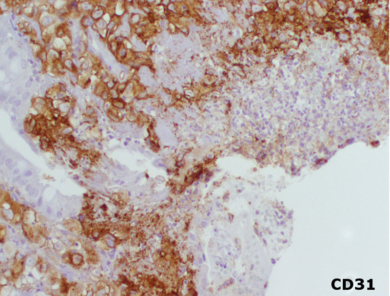 Imaging studies (computed tomography scan of the abdomen and chest radiograph) did not reveal a source for the bleeding or a mass lesion. The EGD demonstrated multiple red-brown polypoid masses within the stomach and duodenum (Figure 1).The biopsies, of both the stomach and duodenum, demonstrated large cells with amphophilic cytoplasm and irregular nuclei with vesicular chromatin and prominent nucleoli infiltrating the lamina propria (Figures 2 and 3). There was subtle vasoformation and, notably, no overlying dysplasia was identified. The neoplastic cells were positive for pan-cytokeratin, cytokeratin 7 (Figure 4), CD31 (Figure 5), and CD34. The neoplastic cells were negative for CDX2, TTF-1, S-100 protein, cytokeratin 20, cytokeratin 5/6, and calretinin.