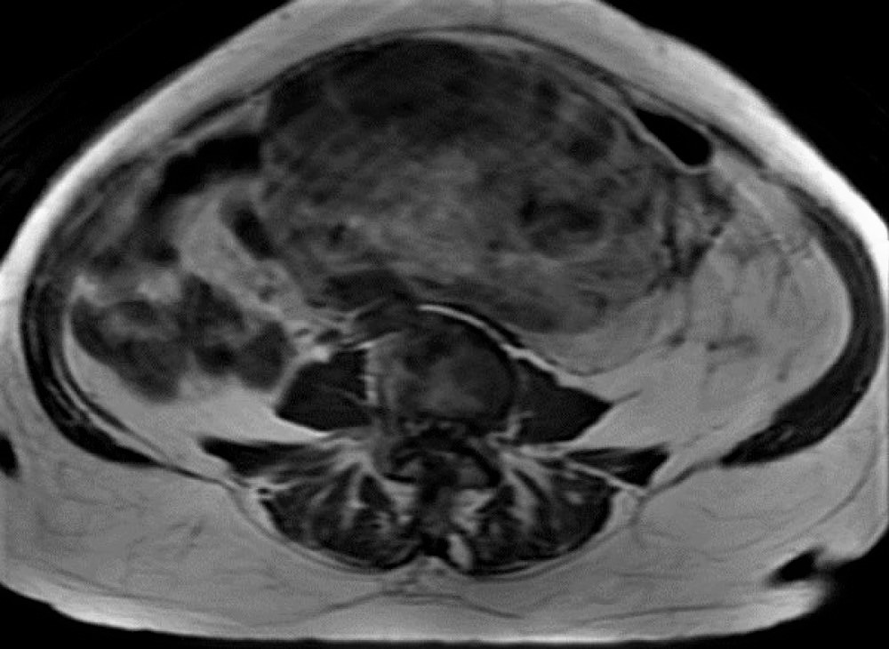 Magnetic resonance (MR) scan of the abdomen and pelvis revealed a large (27.2 cm) retroperitoneal, complex, infiltrative, heterogeneous lesion involving predominantly the mid and left abdominal and pelvic region. Within the mass, there is a circumscribed, complex component with multiple solid heterogeneous nodular foci (Figure 1). The patient had a needle biopsy to establish the diagnosis and subsequently had the mass resected.