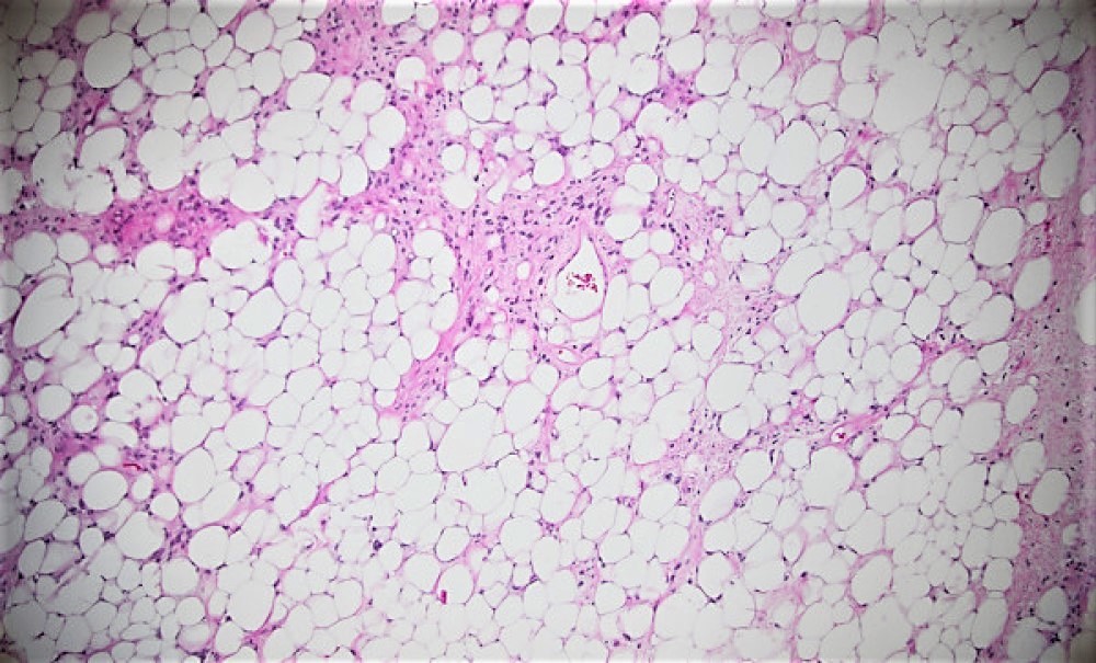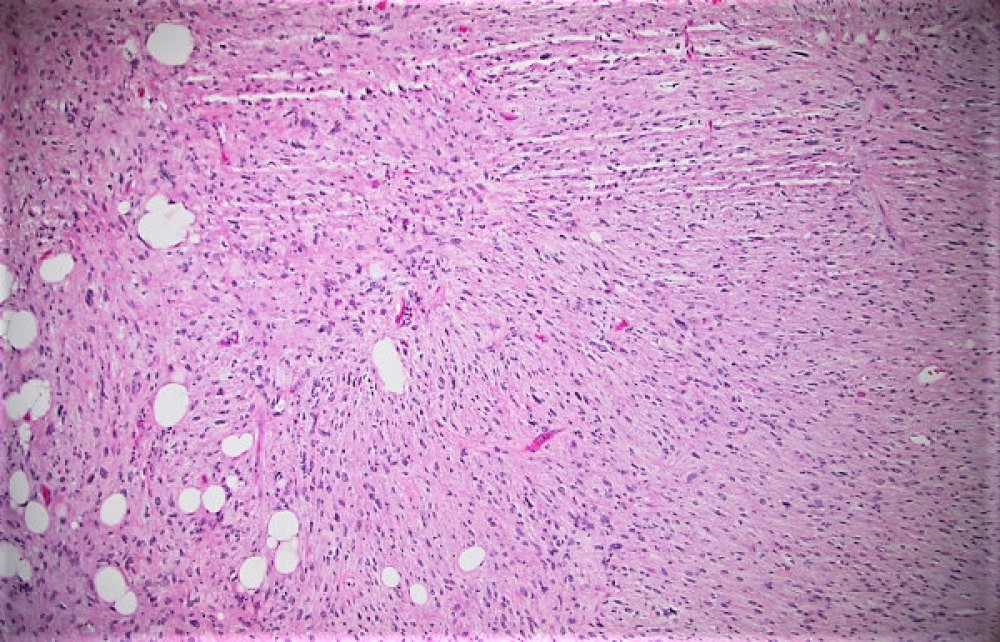 Sections of the biopsy revealed lobules of adipocytes admixed with the areas of an atypical spindle cell proliferation with moderately to markedly pleomorphic cells arranged in loose fascicles or storiform pattern within a fibrotic, focally myxoid stroma. Approximately 60-70% of the tumor was replaced by necrosis. Ki-67 proliferation index was 5-10%. Immunohistochemical staining demonstrated strong positivity with MDM2, CDK4 and p16 which supported the diagnosis.