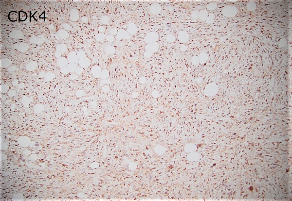 Grossly, the resection specimen demonstrated a large nodular yellow-tan mass with firm, pink-tan fleshy foci (Figure 2). Histologically, there was a transition between lobules of a well-differentiated atypical adipocytic neoplasm (Figures 3 and 4) to a high-grade pleomorphic and spindle cell sarcoma (Figures 5 and 6). There were foci of myxoid change and cells with rhabdoid-like morphology (Figure 7). Both the low-grade and high-grade components expressed CDK4, MDM2, and p16 (Figures 8-10), while immunohistochemical stains for myogenin and MyoD1 were negative.