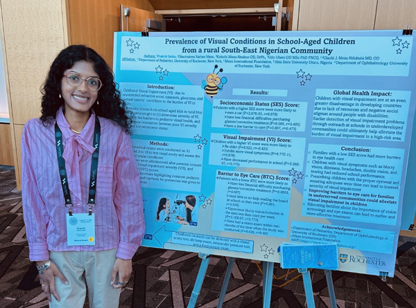 Congratulations to Prakriti, a global health student in the Mezu-Ndubuisi Lab, for presenting her research poster titled, "Factors affecting Visual Impairment in School-Aged Children in South-East Nigeria," at the Global Ophthalmology Summit in Chicago, Illinois held August 15-17, 2025. Prakriti investigated the impact of overlooked socio-economic barriers to eye care for families with young children, in order to reduce visual impairment in children in underserved communities. IRB approval for this research was obtained from collaborating institution, Abia State University, Uturu, Nigeria.