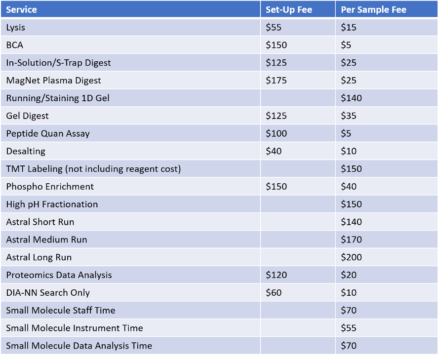 The Mass Spectrometry Resource Laboratory bills projects based on usage fees calculated against our operating costs. In addition, any special consumables that are necessary for your project (ie. column, IP beads, reagents) that the MSRL does not have as regular stock are an additional charge (or can be provided by your laboratory). For FY26, pricing for our most used services is below. Users external to the University of Rochester pay an additional 51% indirect recovery cost.