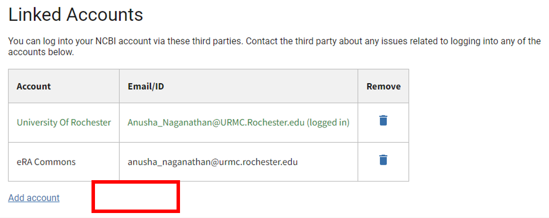 5. To populate with information from these accounts, you will first need to link your MyNCBI with those accounts (in the screenshot below, I have linked my NCBI account with my UR account and eRA commons account).