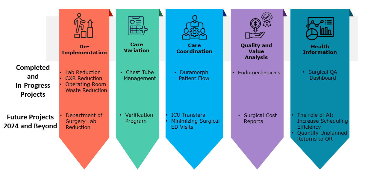 The Surgical Value Incubator program is dedicated to enhancing value across the five phases of surgical care. We design and implement projects that are strategically aligned with these phases, ensuring a comprehensive approach to improving surgical outcomes and patient experiences while decreasing cost. By analyzing data, collaborating with healthcare professionals, and employing evidence-based practices, our initiatives aim to elevate the standards of care in each phase, fostering continuous improvement and ensuring that our projects directly contribute to surgical quality improvement themes.